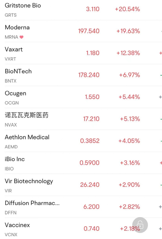 美股抗疫概念股普遍上涨,Gritstone Bio涨超20%,诺瓦瓦克斯医药涨5.13%,BioNTech涨6.97%,阿斯利康涨0.43%,吉利德科学涨0.24%。