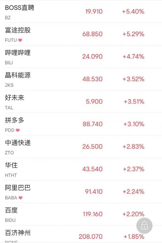热门个股中,爱奇艺涨超9%,富途控股涨超5%,哔哩哔哩、微博涨超4%,拼多多涨超3%,百度、阿里巴巴涨超2%,腾讯音乐、唯品会涨超1%,网易、京东、满帮小幅上涨。