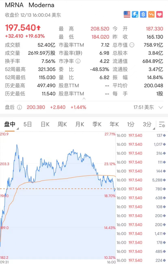 美东时间12月13日,美股医药巨头莫德纳大涨近20%,至11个月最高,创约一年最大涨幅,报197.54美元/股,最新总市值758.9亿美元。