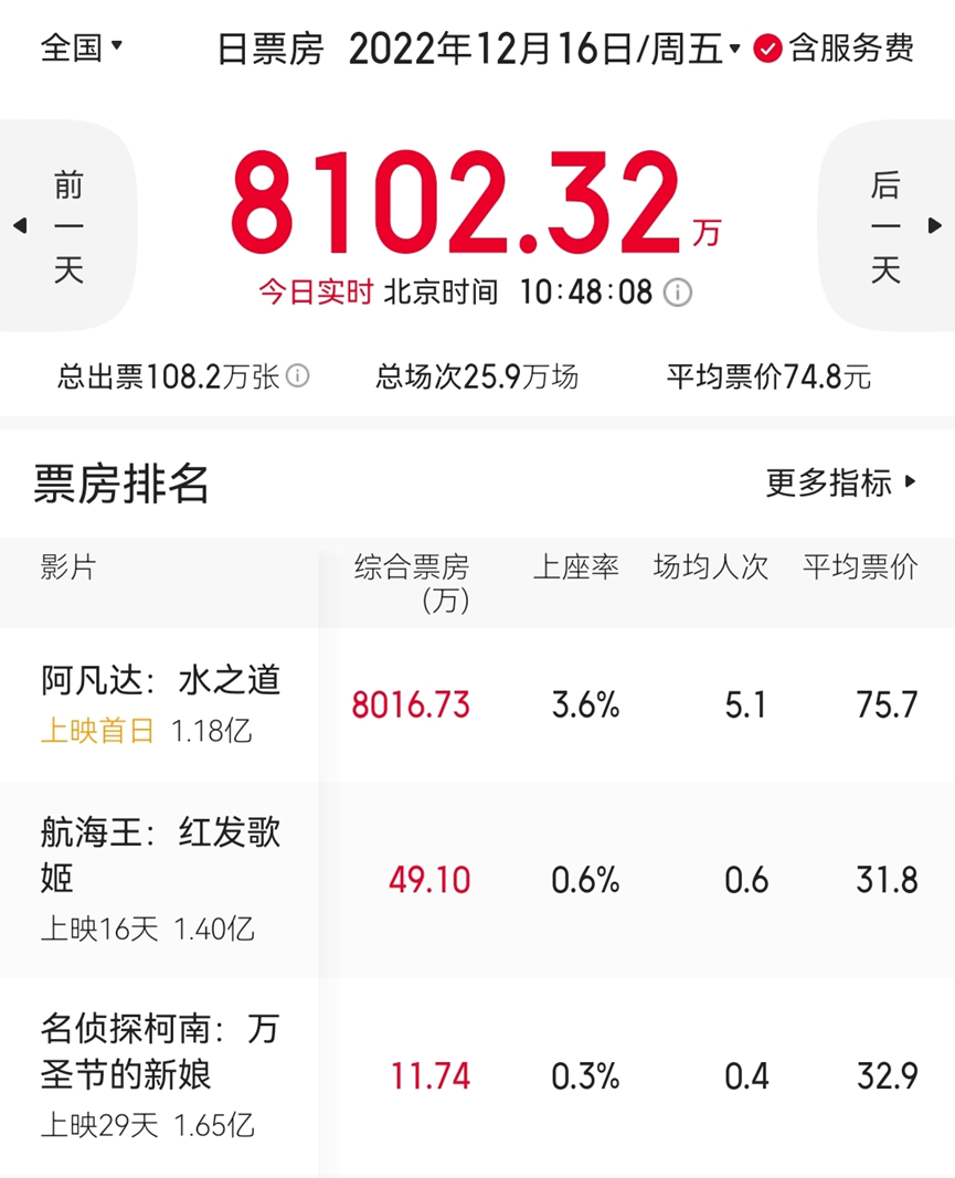 “看目前的情况,《阿凡达2》票房估计应该能到20亿元人民币,但再往上就不好说了,因为国产片的春节档很快也要来了。”电影博主“电影榨汁”表示。
