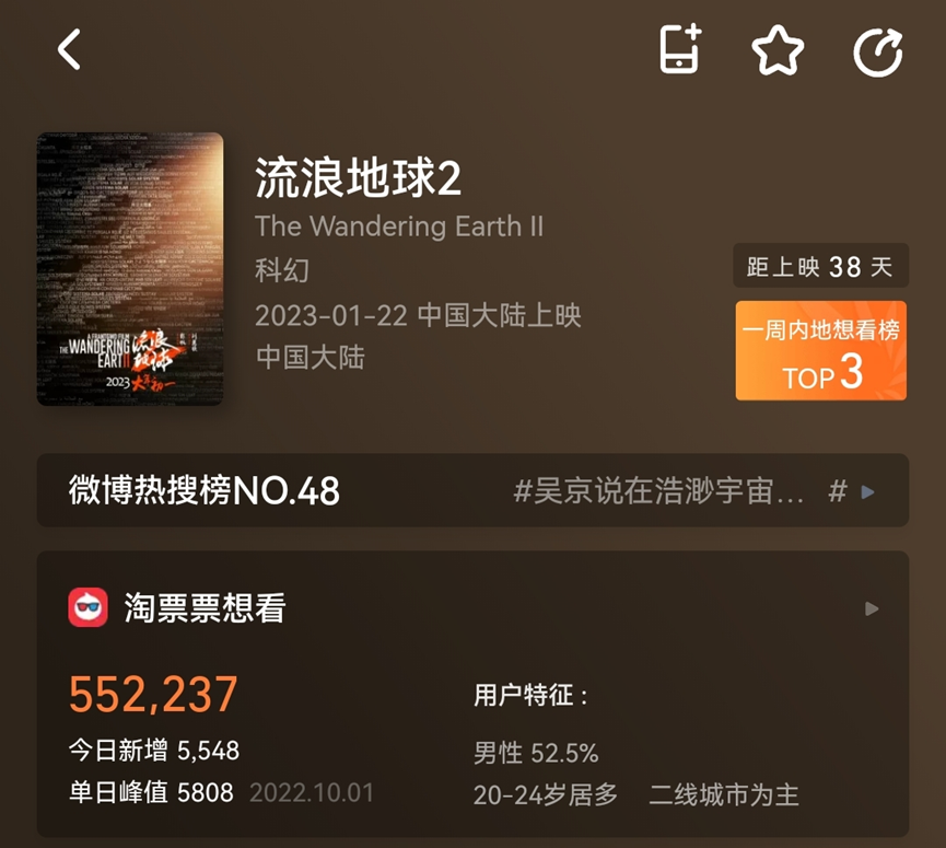 在内容供给方面,大鹏导演的《保你平安》,常远、魏翔等主演的《绝望主夫》两部热门影片已定档12月31日。《流浪地球2》也在12月14日放出预告片,预计将在2023年大年初一上映。