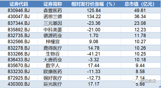 Wind的统计显示,截至今天,北交所的医药生物公司总共有13家,总市值达到205.04亿元。其中,市值最大的是森萱医药,为49.61亿元;其次是诺思兰德,为36.34亿元,三元基因、中科美菱、梓橦宫等的市值也在10亿元以上。