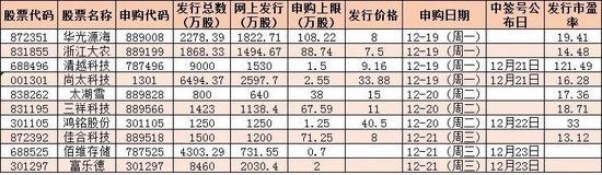 根据发行安排,下周(12月19日-23日)有10只新股发行,周一安排4只,周二和周三分别有3只。周一分别为,尚太科技、华光源海、浙江大农、清越科技;周二为,太湖雪、三祥科技、鸿铭股份;周三为,佳合科技、佰维存储、富乐德。