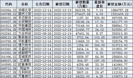 与此同时,统计显示,下周(12月19日-23日)共有82家公司合计96.6亿股限售股陆续解禁。按最新收盘价计算,解禁市值为1176.32亿元。从解禁市值来看,华峰化学(188.48亿元)、悦心健康(153.14亿元)等公司解禁金额均超150亿元。
