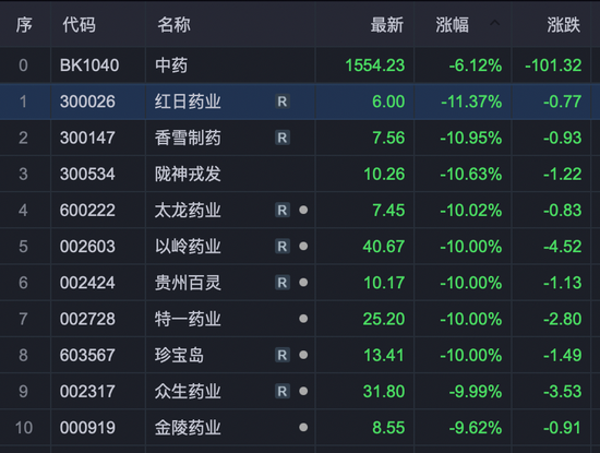 其中,中药板块方面,龙头以岭药业跌停,红日药业、香雪制药、太龙药业、特一药业等跌幅均超过10%。
