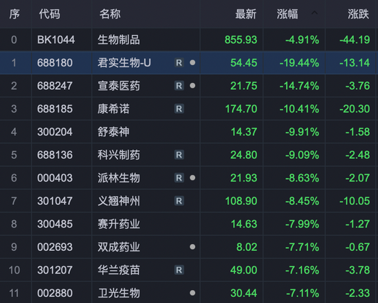 另外,生物制品方面,君实生物大跌19.44%,康希诺大跌10%,东宝生物、科兴制药、派林生物、华南疫苗等跌幅也较大。