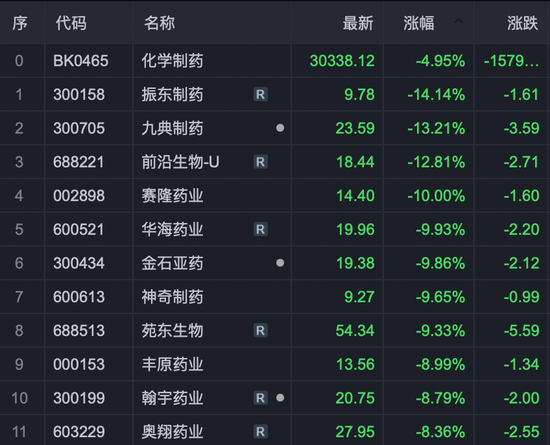 化学制药板块,振东制药大跌14%、前沿生物、九典制药跌幅超过10%,华海药业、金石亚药、拓新药业等跌幅超过7%。