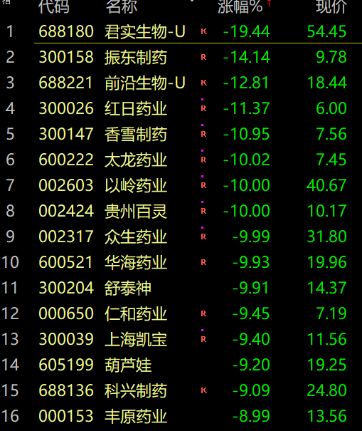 医药股掀跌停潮!检测、医药、口罩全军覆没!以岭药业、众生药业、特一药业、太龙药业、贵州百灵等近10股集体跌停,宣泰医药、振东制药、九典制药、香雪制药等多股跌超10%。