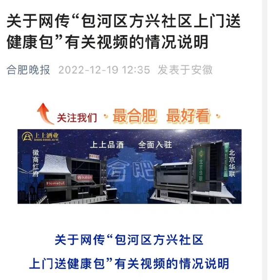 据合肥市包河区融媒体中心官微消息,近日,网传有关视频,质疑包河区方兴社区工作人员在上门送健康包时存在违规发放和拍照作秀等情形,引起网友持续关注。经调查核实,具体真实情况如下: