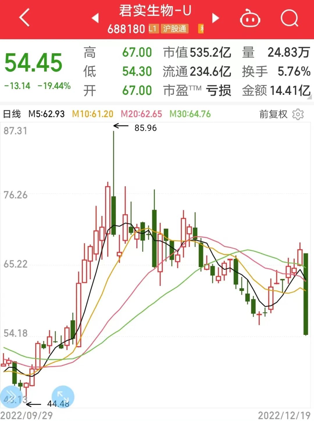 跌幅最大的是君实生物-U,该股今日下跌19.44%,股价跌破60日均线,A股市值单日减少100.33亿元。该公司是创新药龙头之一,公司过去数年净利润持续亏损,今年前三季度净利润亏损15.95亿元。截至三季度末,公司股东户数3.6万户。