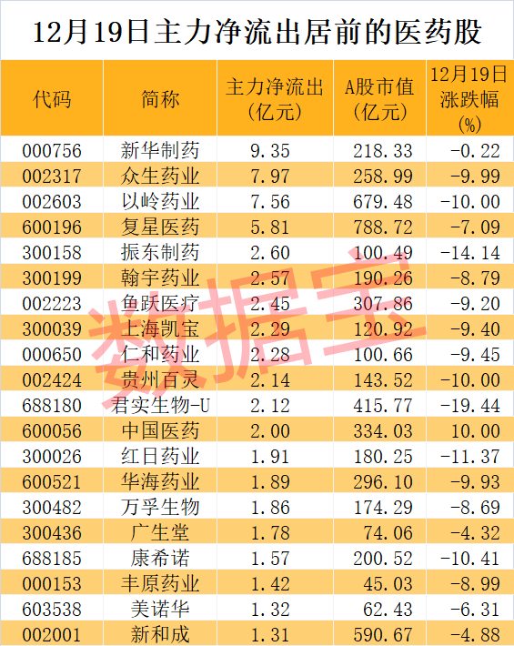 证券时报·数据宝统计,12月19日主力资金净流出最高的是医药生物行业,净流出资金超130亿元。新华制药、众生药业、以岭药业、复星医药等4股主力净流出逾5亿元。地产、轻工制造两大行业净流出力度最小,主力净流出金额均不到亿元。中交地产、格力地产、深振业A、广宇集团、招商蛇口等地产股获主力净流入超5000万元。