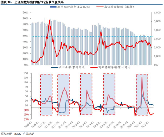 2)顺周期在地产和出口共振上行时逻辑更顺,当两者错位或共振下行是往往顺周期板块缺位主线。顺周期板块主要受到地产和出口产业链景气的影响,2003年中国加入WTO以后,中美经济周期大部分时候是共振的(形式多为全球大衰退后的共振复苏),因此代表国内需求的地产产业链和代表海外需求的出口产业链往往是同步上行或下行的,因此如2006-2007,2009,2017,2020下半年两者共同上行的阶段投资者逻辑顺畅,主线行情强度较大,但当两者背离时容易导致景气逻辑不顺畅,如2012-2014期间海外需求再企稳后国内经济下台阶,2022出口韧性地产疲弱,此时大多数顺周期板块难以贡献持续的主线;