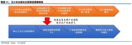 2)2013年的影视、手游板块实际上也有较好的业绩支撑才得以形成主线行情,我们认为目前政策预期最足有望接棒的泛大安全也不例外,目前大部分相关领域均还在0-1的阶段。我们预计产业形成主线行情的逻辑链条预计为:二十大等核心政策报告提高重视程度-后续如两会等持续政策跟进强化基调-中央和地方项目布局跟进转向落地-社会资本跟进投产放量-景气数据快速攀升-核心上市公司业绩验证-政策基调持续积极不止-产业盈利逻辑形成一致预期-增量资本进入渗透率爆发。产业目前刚刚完成逻辑链条的第一环,处于早期的政策驱动阶段,预计明年多以主题性机会为主,若超预期形成主线行情契机可能在于部分行业的,但不排除最快明年两会后在稳增长基调延续下有更多刺激性政策和项目落地从而加快逻辑链条的拓展。