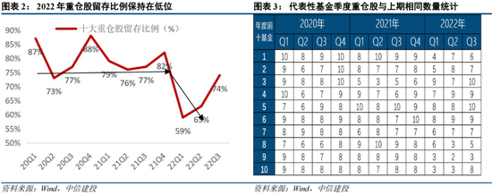 代表性基金的重仓股换仓频率明显加快。我们选取每年的代表性基金(50亿元规模以上的收益率前十名)从其前十大重仓股的季度更换频次来看,2020-2021年表现最优异的大规模基金其上个季度前十大重仓股的7-8只会留到下个季度,而这个比例在今年仅剩下5-6只,考虑到大规模基金换仓成本较大,留存比例下滑确实比较明显,代表性基金持股周期更短,换手率更高。该现象充分说明了2022年动态配置策略获得了胜利,“运动战”成为机构不得不面对的选择。
