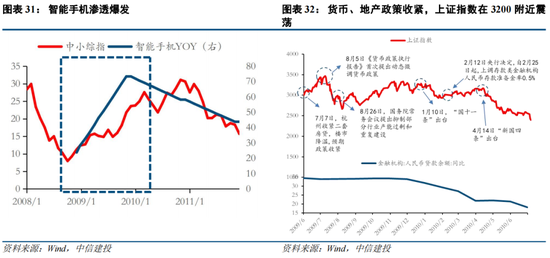 3)顺周期缺位但景气赛道补足时市场出现持续性的结构性主线。当顺周期板块受经济周期下行影响无法贡献主线行情逻辑时,新兴产业变迁主导的景气赛道板块往往能补足缺口,主要包括:2009下半年-2010上半年,彼时货币地产紧缩拐点愈发明朗,但智能手机产业链进入渗透爆发,带动当时的中小板成为主线,上证指数得以在3200附近走出震荡市;2013年经济弱复苏后迅速下行,但智能手机渗透率打满后催化的移动互联网景气赛道补足了顺周期的缺位,因此投资者得以见证创业板指数一年翻一倍;2021年亦是国内经济在二季度后迅速下台阶,但是新能源补足了这方面的缺口,因此上证指数全年在3500点附近走出震荡市,但市场确实具备强劲的景气赛道主线;