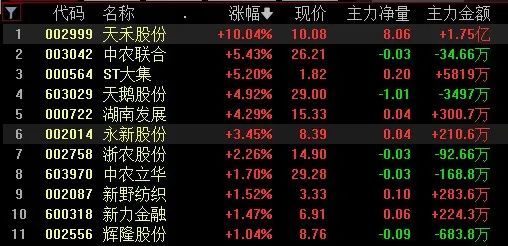 从表现强势的供销社看,板块内有11只个股实现上涨,其中,天禾股份、ST大集(维权)涨停,中农联合也大涨5.20%。