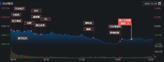 12月20日,A股三大指数继续调整,上证指数跌超1%失守3100点关口。截至收盘,上证指数跌1.07%报3073.77点;深证成指跌1.58%报10949.12点,创业板指跌1.53%报2310.8点;两市合计成交6398亿元,北向资金净买入11.56亿元。总体上看,A股个股跌多涨少,超2100只个股上涨,其中,涨停个股达33只,跌停个股达34只。