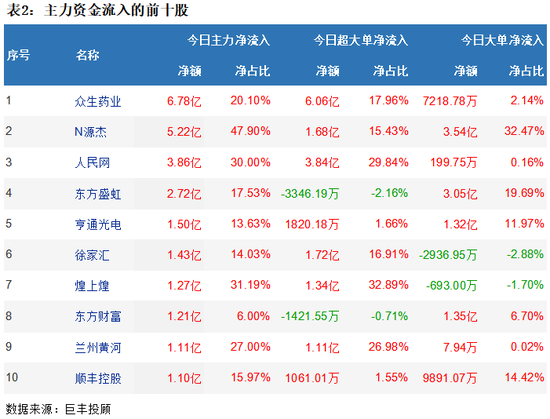 从两市个股主力资金流向来看,众生药业获主力资金净流入6.78亿,N源杰主力资金5.22亿净流入,人民网获主力资金净流入3.86亿,东方盛虹获主力资金净流入2.72亿,亨通光电获主力资金净流入1.50亿。