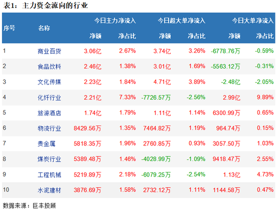 从两市行业板块资金流向来看,商业百货板块获主力资金净流入3.06亿,食品饮料板块获主力资金净流入2.46亿,文化传媒板块主力资金净流入2.23亿,化纤板块主力资金净流入2.21亿,旅游酒店板块主力净流入1.74亿。