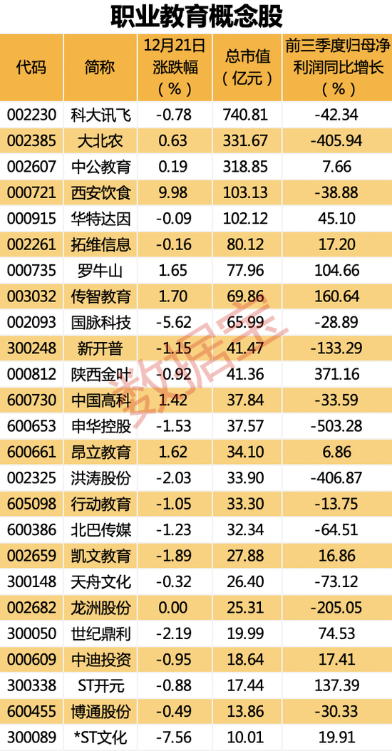证券时报·数据宝统计,A股中布局职业教育的上市公司共有25家,包括主营业务为教育的上市公司和产教融合型上市公司。12月21日,7只概念股实现上涨,西安饮食涨停,传智教育、罗牛山、昂立教育、中国高科上涨1%以上。