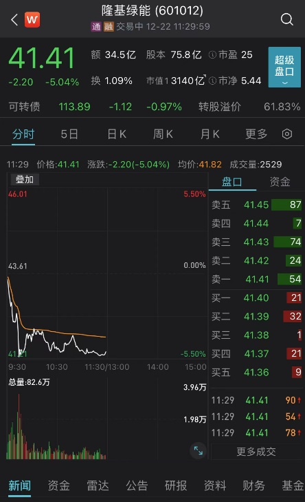 隆基绿能一开盘就直线下跌,上午下跌5.04%,总市值为3140亿元。