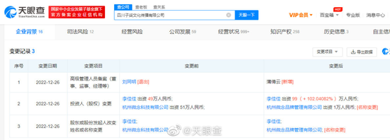 天眼查App显示,近日,四川子柒文化传播有限公司发生多项工商变更:监事由刘同明变更为蒲倩云;杭州微念品牌管理有限公司持股比例由51%减至1%,李子柒(李佳佳)持股比例由49%增至99%。目前,李子柒为该公司疑似实际控制人。