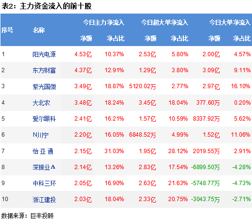 从两市个股主力资金流向来看,阳光电源获主力资金净流入4.53亿,东方财富获主力资金4.37亿净流入,紫光国微获主力资金净流入3.49亿,大北农获主力资金净流入3.48亿,爱尔眼科获主力资金净流入2.41亿。