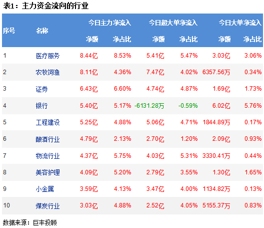 从两市行业板块资金流向来看,医疗服务板块获主力资金净流入8.44亿,农牧饲渔板块获主力资金净流入8.11亿,证券板块主力资金净流入6.43亿,银行板块主力资金净流入5.40亿,工程建设板块主力净流入5.25亿。