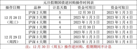 12月28日星期三,如果选择2天期国债逆回购品种,可以享受到5天的收益,12月30日资金可用,1月3日资金可取。