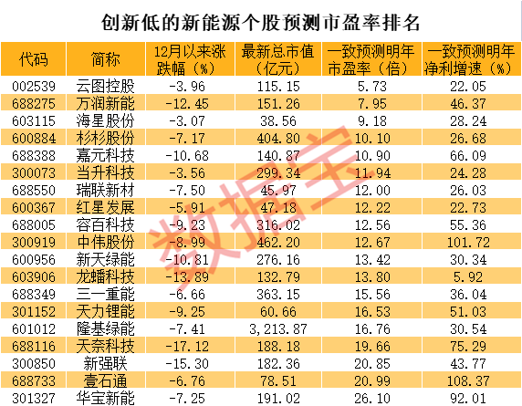 成长板块在本轮反弹中表现不佳,国防军工、计算机、通信、电力设备等板块指数11月以来逆市下跌。一批新能源龙头近期股价创出年内新低。其中,光伏龙头隆基绿能12月大跌超7%,最新总市值超过3200亿元。此外,中伟股份、杉杉股份等10多只百亿市值新能源股票创出年内新低。部分新能源股票估值低至个位数,云图控股、万润新能、海星股份等个股机构一致预测明年市盈率不足10倍。此外,杉杉股份、嘉元科技、当升科技等个股机构一致预测明年市盈率不足12倍。