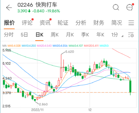 午盘公司股价跌幅快速扩大,收盘跌幅近20%。自今年6月登陆港股以来,快狗打车已经下跌逾8成,目前市值21亿港元。