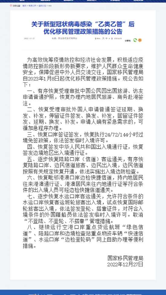 国家移民管理局12月27日发布公告,内地居民旅游、商务赴港签注明年1月8日(下周日)起有序恢复办理。