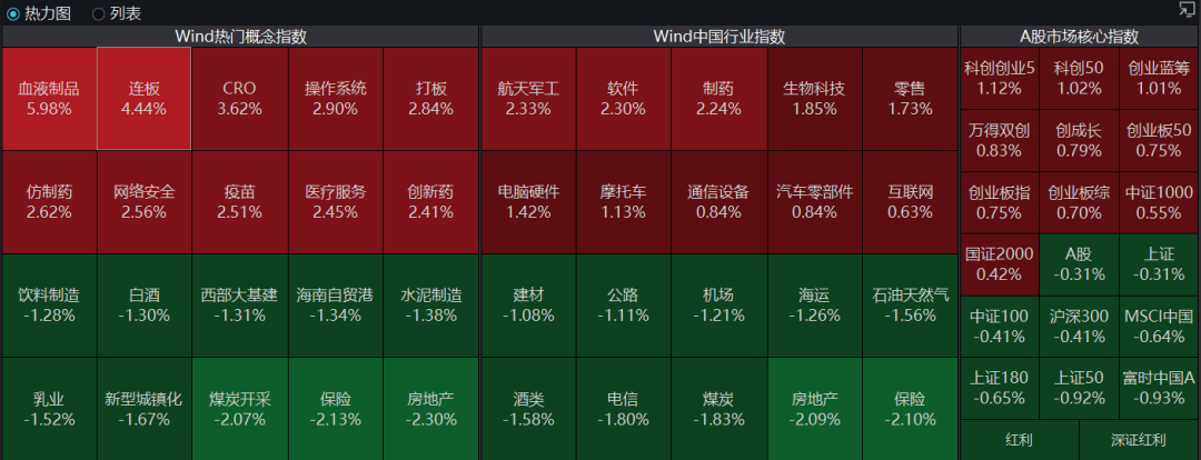 医药商业板块中,健之佳率先涨停,益丰药房、一心堂、老百姓、大参林等多股大涨;医疗服务板块中的CRO板块表现尤为强势,康龙化成、美迪西、泰格医药等涨幅居前;生物制品中的血制品相关公司股票表现强势,卫光生物率先涨停,华兰生物、博雅生物、天坛生物等跟涨。