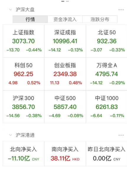 两市共1576只个股上涨,3331只个股下跌,北向资金净卖出11亿元。