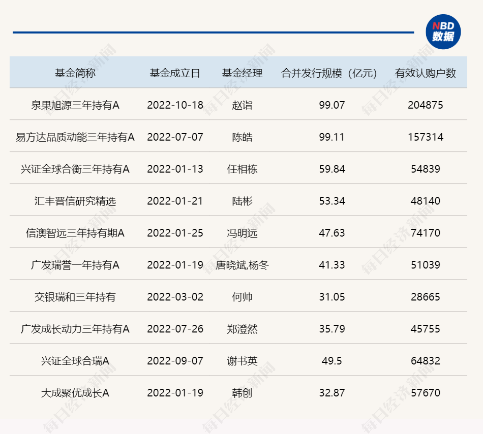 排在第一位的是赵诣加盟泉果基金后的首只基金——泉果旭源三年持有,该基金募集时间仅2天就达到了100亿元规模上限,行业与投资者的热情可见一斑。紧随其后的是成立于今年7月的易方达品质动能三年持有混合基金,发行总规模99.11亿元、有效认购户数15.7万户,由陈皓担任基金经理。此外还有多只偏股混合型基金的发行总规模也超过50亿元,在今年的市场行情下显得尤为难得。