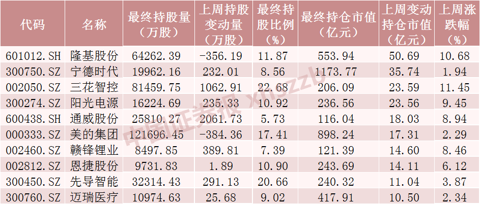 上周北向资金持仓市值增加额居前十的股票中除隆基股份、美的集团被北向资金分别减仓356.19万股、384.36万股外,其他股均被北向资金加仓,其中对三花智控、通威股份的持股增加数超1000万股。