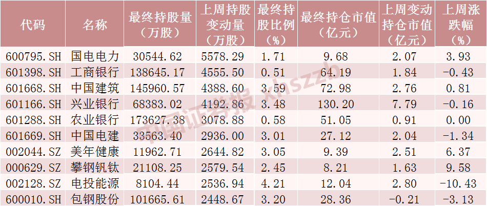从市场表现情况来看,上周北向资金持股增加数居前十股涨跌参半,攀钢钒钛涨幅最大,累计上涨9.58%;电投能源跌幅最大,上周累计下跌10.43%。