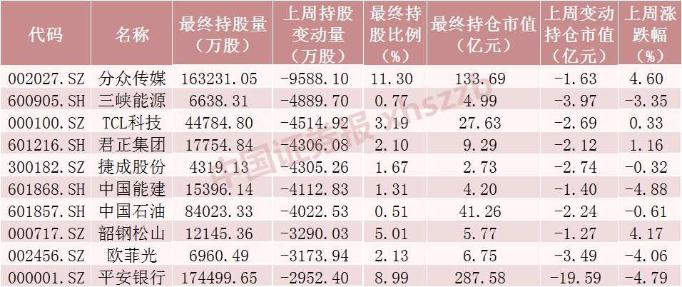 从市场表现上来看,上周北向资金减仓股数居前十股跌多涨少,分众传媒涨幅最大,上周累计上涨4.60%;中国能建跌幅最大,上周累计下跌4.88%。