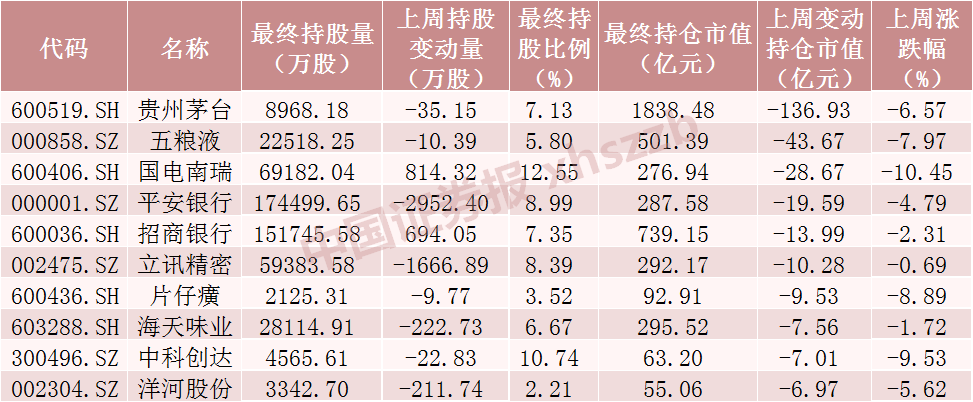 从市场表现上来看,上周北向资金持仓市值减少额居前十股均下跌,国电南瑞跌幅最大,上周累计下跌10.45%。
