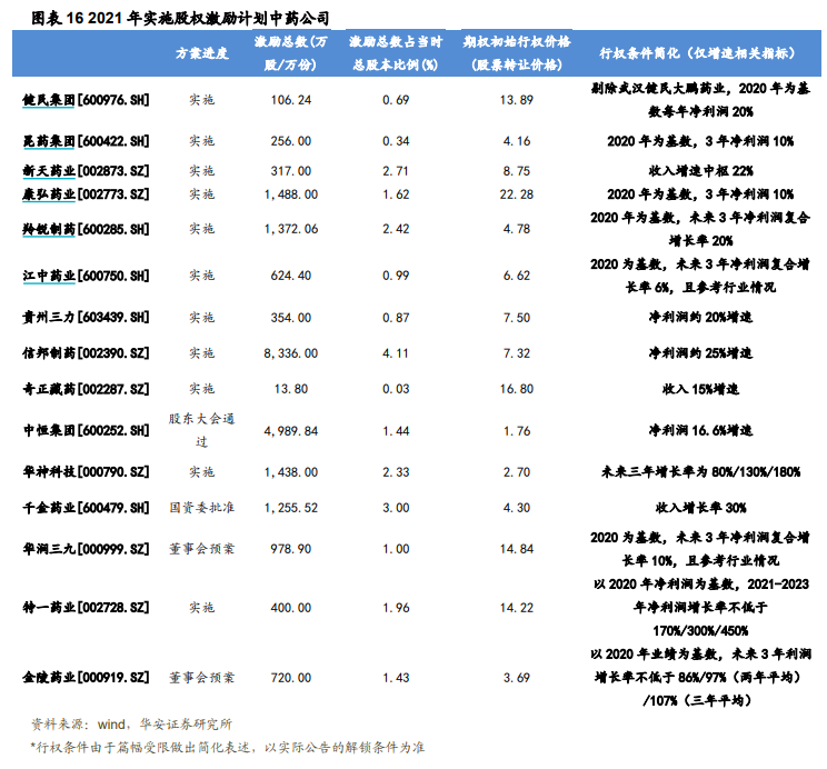 国企改革成为主调,股权激励体现企业端信心。2021年中药上市公司中有15家公司实施或者公布了股权激励方案,解锁条件上利润端或者收入端要求的未来复合增速对比过往三年的复合增长率,基本都有所上调。