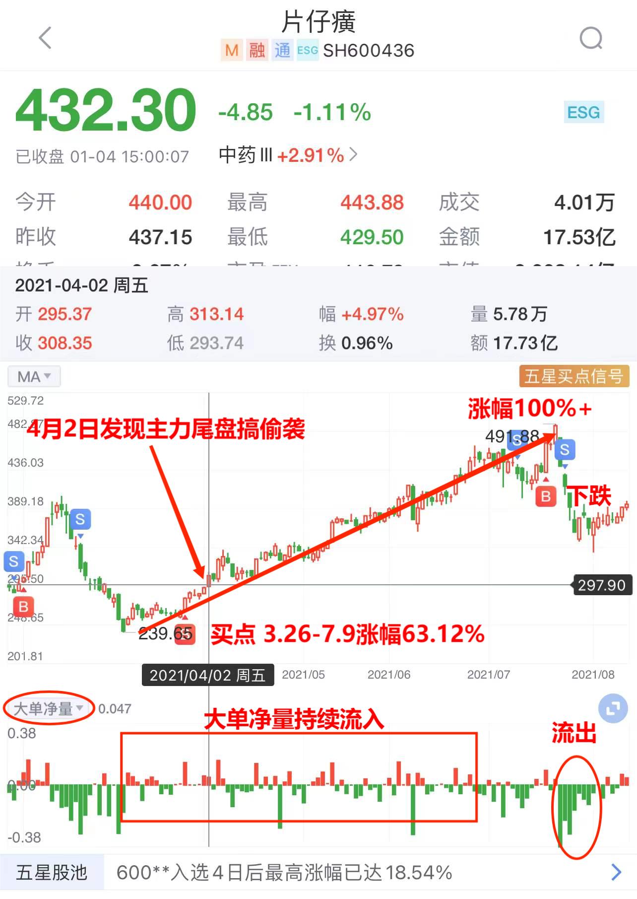 4月2日,尾盘掘金发现了主力潜伏片仔癀的迹象,并在当天14点50分进行了异动提醒。查股网Level-2大单净量的数据显示,其实从3月上旬开始至今,大单净量就呈现出了持续大幅流入的状态,表明主力资金正在持续加码介入,这也推动了股价的不断上涨,片仔癀的股价从240元左右涨到了492元左右,涨幅超过了100%。