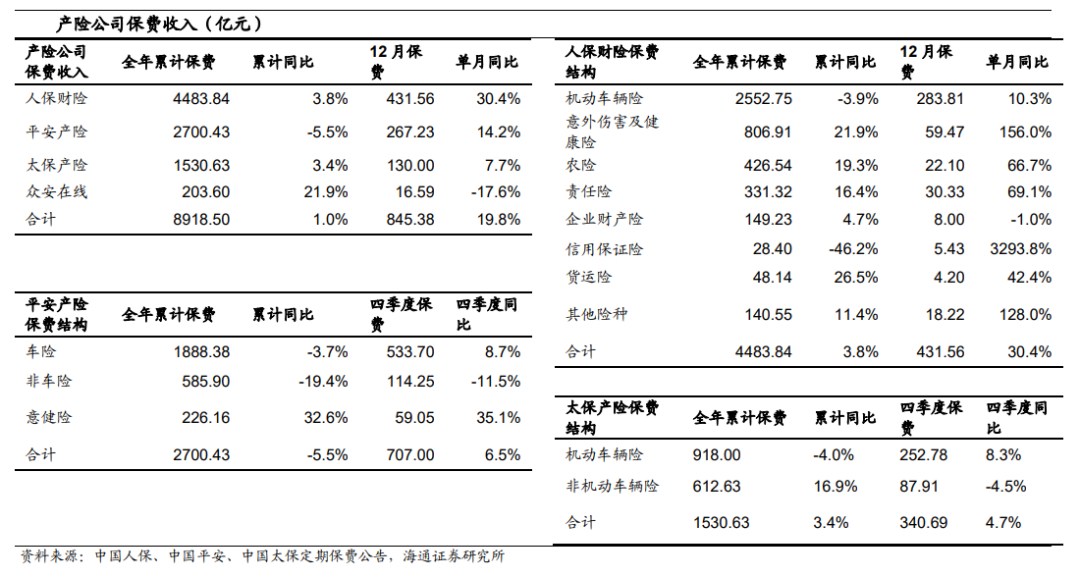 虽然全年数据仍是同比下滑,但单看2021年12月以及四季度数据的话,车险保费收入已企稳。人保财险2021年12月车险保费单月同比增长10.3%;平安产险、太保产险2021年四季度车险保费收入分别同比增长8.7%、8.3%。