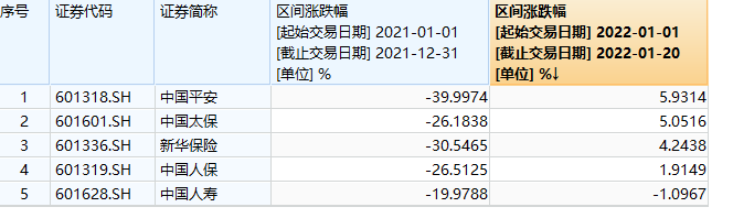 2021年,A股五大险企股价均表现低迷,累计跌幅均达两位数。