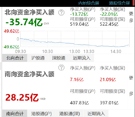 1月25日消息,截至沪深股市收盘,北向资金净流出35.74亿元,其中,沪股通净流出13.72亿元,深股通净流出22.01亿元。