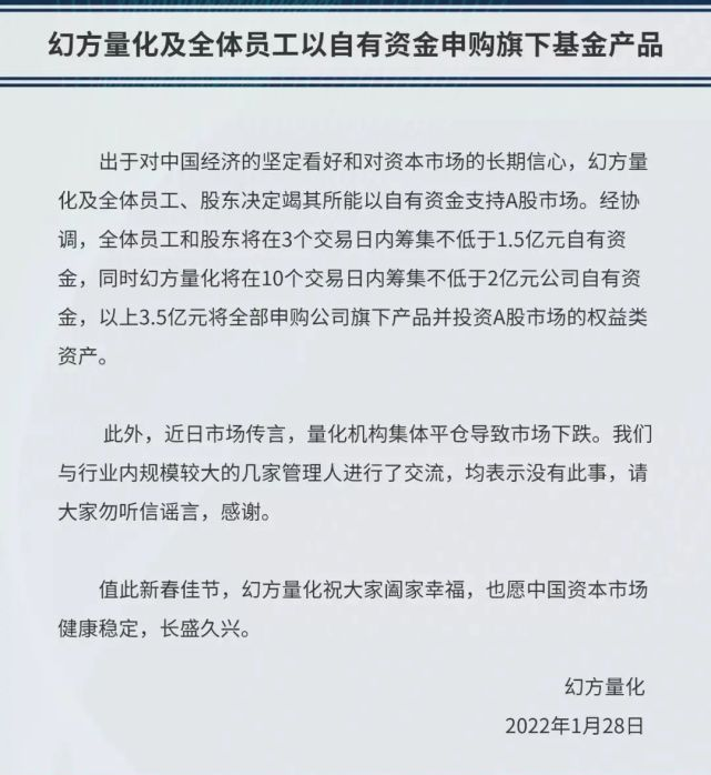 此外,幻方量化发布的公告显示,出于对中国经济的坚定看好和对资本市场的长期信心,公司及全体员工、股东决定竭其所能以自有资金支持A股市场。经协调,全体员工和股东将在3个交易日内筹集不低于1.5亿元自有资金,同时幻方量化将在10个交易日内筹集不低于2亿元公司自有资金,以上3.5亿元将全部申购公司旗下产品并投资A股市场的权益类资产。