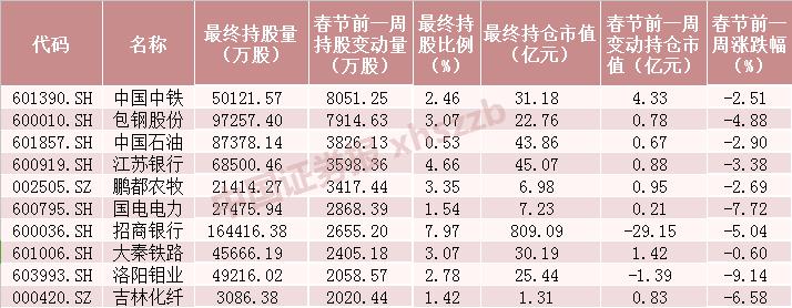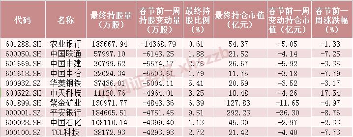 从市场表现上来看,春节前一周北向资金减仓股数居前十个股中,除中天科技(维权)(600522)上涨17.54%外,其他股票均下跌,平安银行(000001)跌幅最大,累计下跌8.76%。