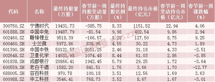 春节前一周北向资金持仓市值增加额居前十的股票中,除宁德时代、中国中免、赣锋锂业被北向资金分别减仓385.75万股、81.54万股、166.57万股外,其他个股均被北向资金加仓,其中对中国中铁、卫星化学(002648)、成都银行(601838)的持股增加数超1000万股。