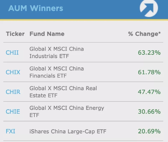过去30天来,美国上市的规模增长最快的中国ETF为下面5只: 跟踪中国工业指数的CHII; 跟踪中国金融行业的CHIX;跟踪中国房地产行业指数的CHIR; 跟踪中国能源指数的CHIE; 以及跟踪中国大盘指数的FXI。