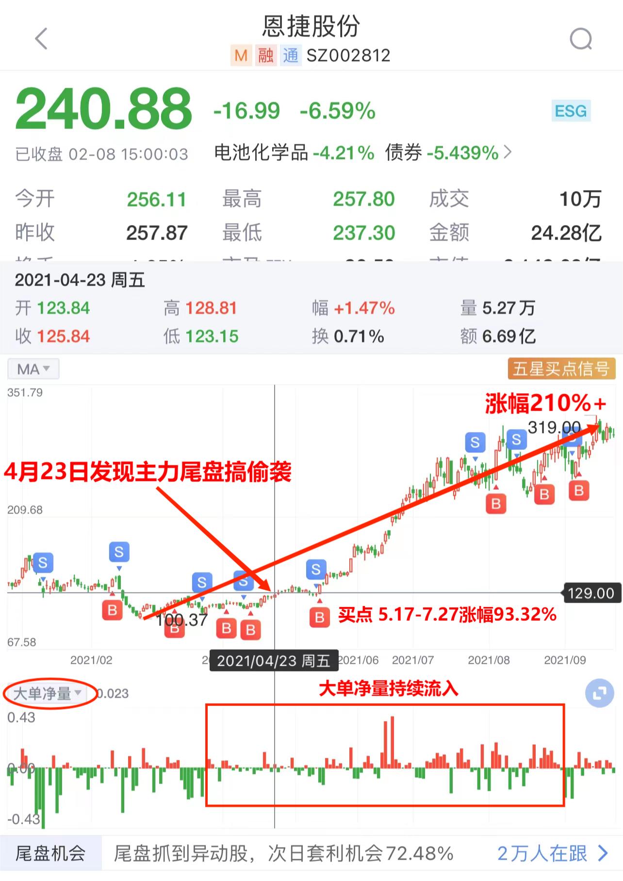 4月23日,尾盘掘金发现了主力潜伏恩捷股份的迹象,并在当天14点50分进行了异动提醒。同时,当天查股网Level-2的大单净量也由流出变为了流入,这意味着有主力资金在行动。