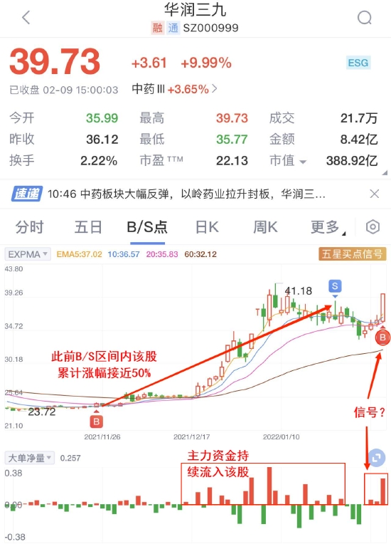 以今日涨停的华润三九为例,通过查股网Level-2的大单净量发现,此前,主力资金近期持续天量流入该股。此前,该股再B/S点信号区间内大涨50%。而近期,B/S点信号再度发出,意味着该股近期再度获得资金关注。